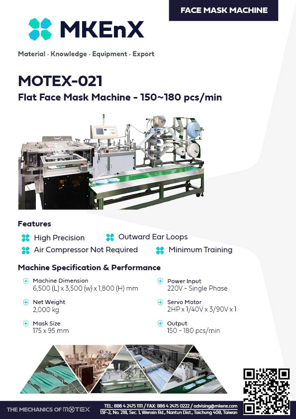 The face mask machines that come with the medical package are Motex-021 and Motex-015; our signature high speed flat mask machines.