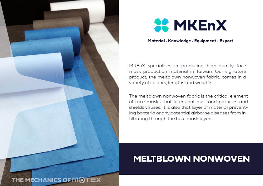 MKEnX的熔噴不織布是口罩的關鍵元素,有效過濾微粒粉塵,吸附病毒及細菌,保護人體免受病毒的侵害,同時保有良好的透氣性、壓差表現。熔噴靜電不織布具有絕佳過濾、吸油及保溫特性,可應用於複合加工產品。